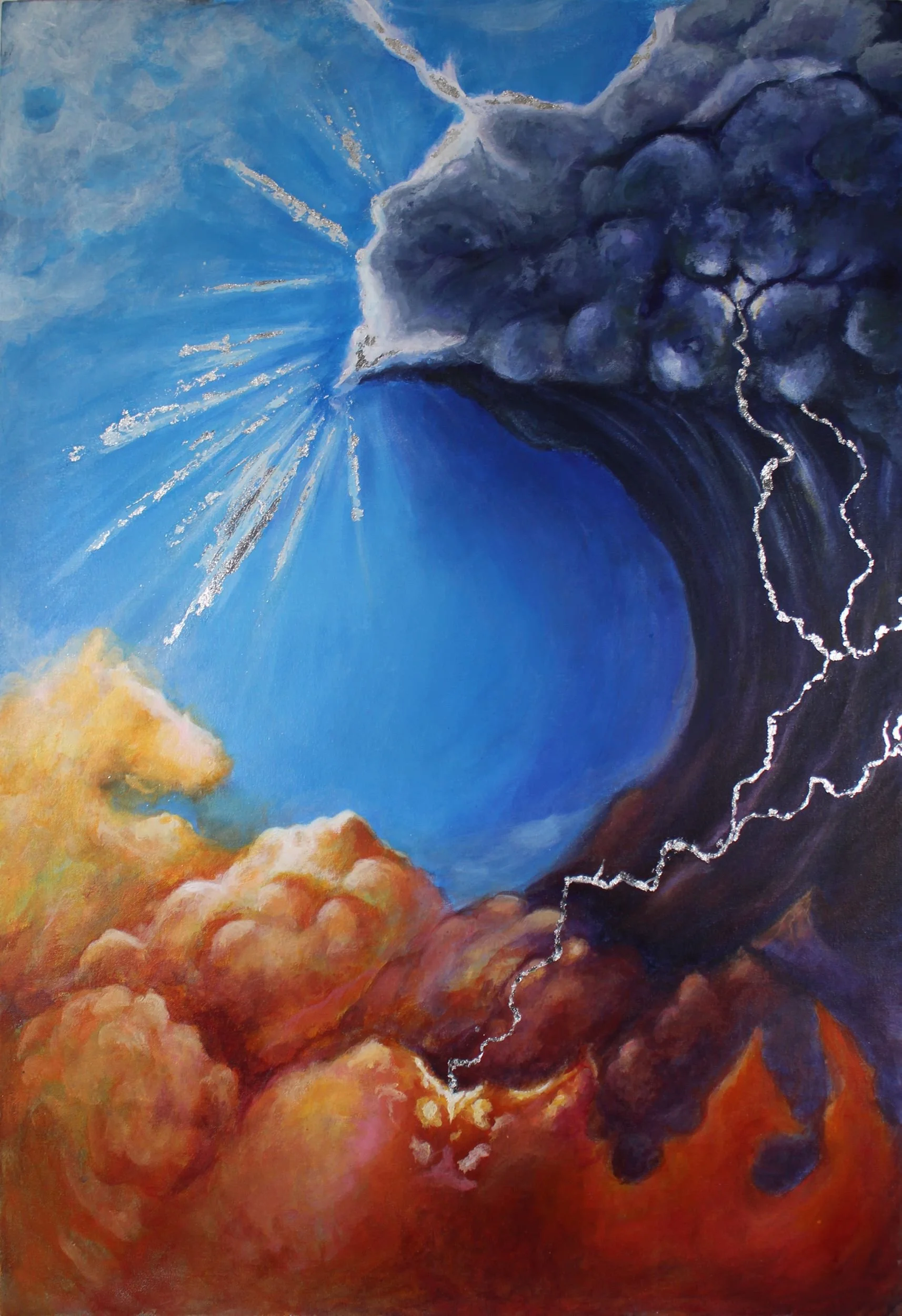 Apocalyptic (Water) Cycle is on the subject of environmentalism. During creation, a fire broke out near town and a big plume of smoke seemed to mirror the devastation of the water cycle hidden in the imagery of this painting. Included, the outline of Lake Mead, the Colorado River, horses, phoenix, a skull, and mountains. The silver leaf used is to reflect the good and bad cycles of life. Colorado’s watershed has largely been impacted by climate change and continues to affect the lower states of the Colorado River. This piece also reflects the nature of the modern news cycle addicted to giving the consumers the whiplash from hope to despair.